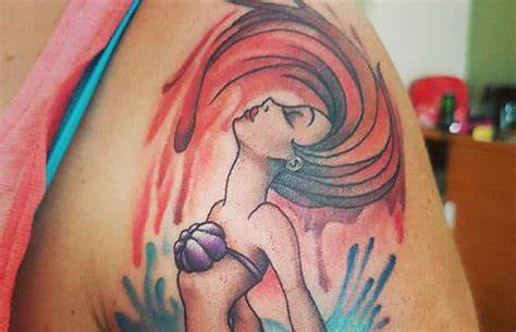 If you want a colorful mermaid tattoo, then Ariel tattoo is a perfect choice. Trust me, A beautiful mermaid with red hair, green tail, and blue eyes will look amazing.